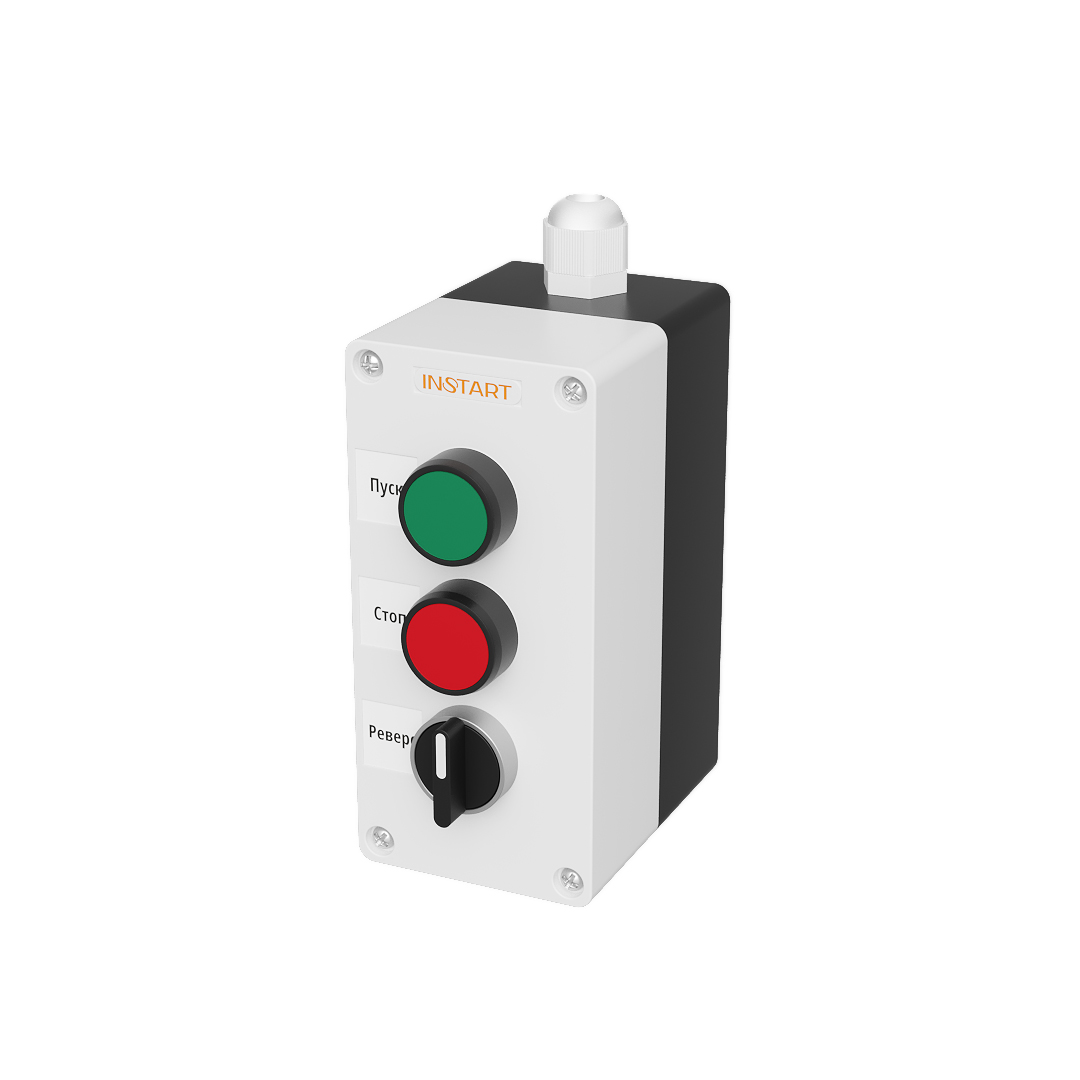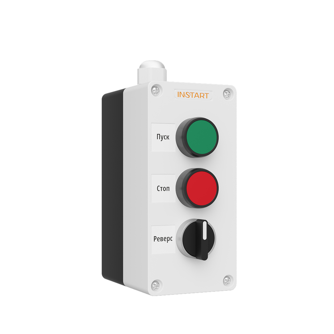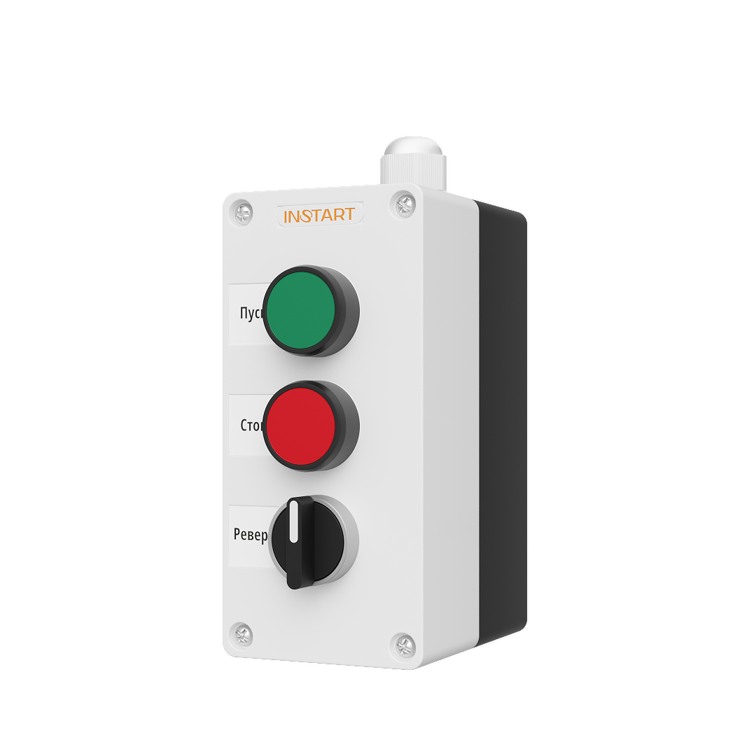 ПУ-3-040 – пульт управления, оснащённый кнопками пуск, стоп, 2-х позиционным переключателем. Предназначен для управления пуском, остановом, выбора направления вращения электродвигателя.