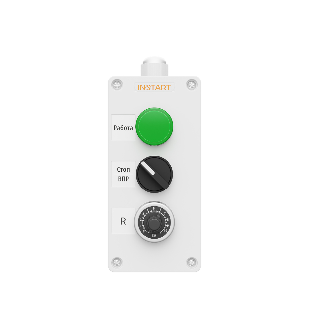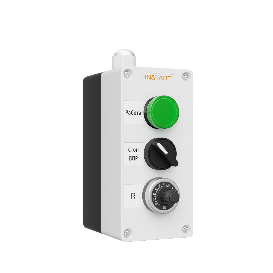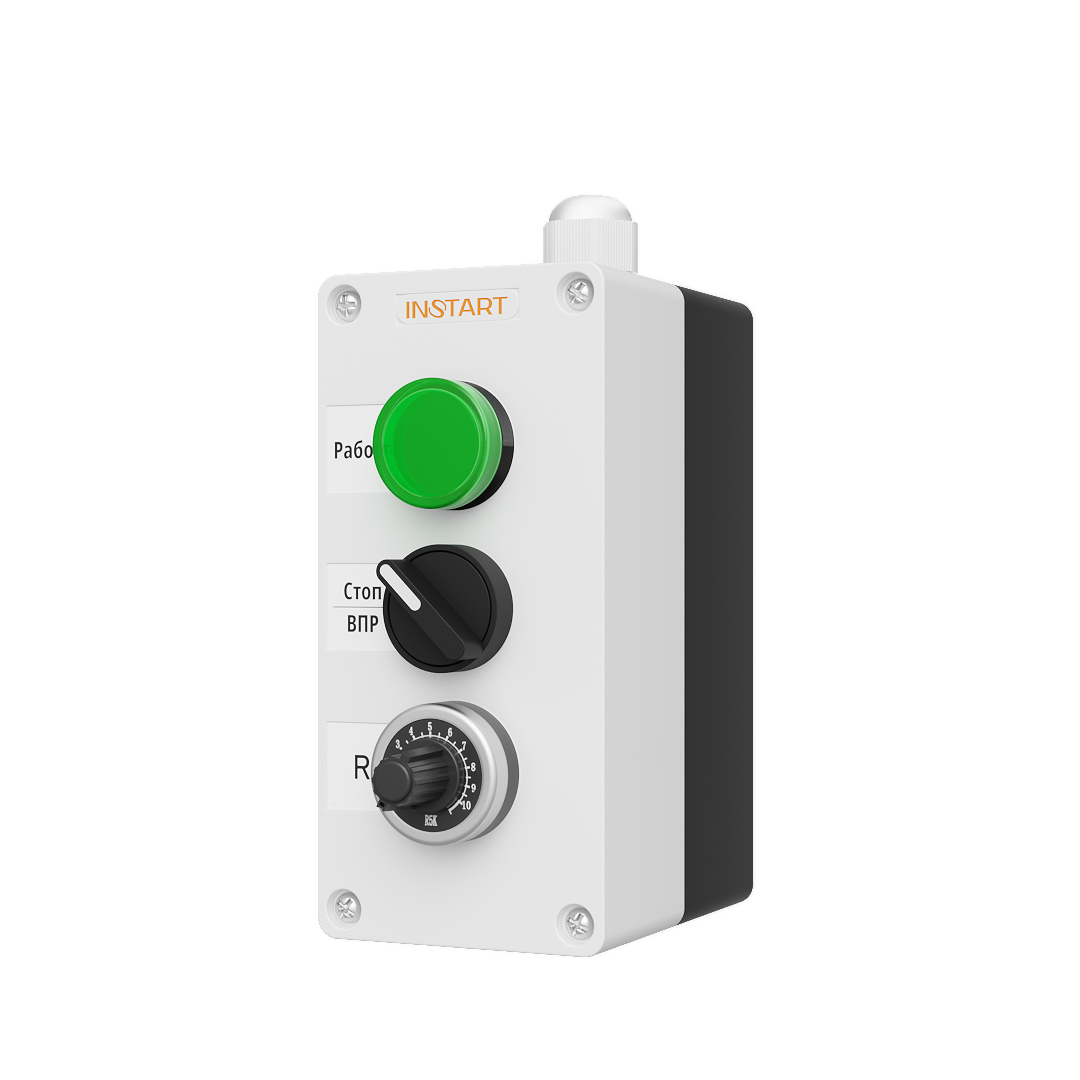 ПУ-3-111– пульт управления, оснащённый индикацией, в виде зелёной лампы 24В, 2-х позиционным переключателем, потенциометром. Предназначен для управления пуском, остановом, изменения опорного сигнала частоты, индикации работы преобразователя частоты