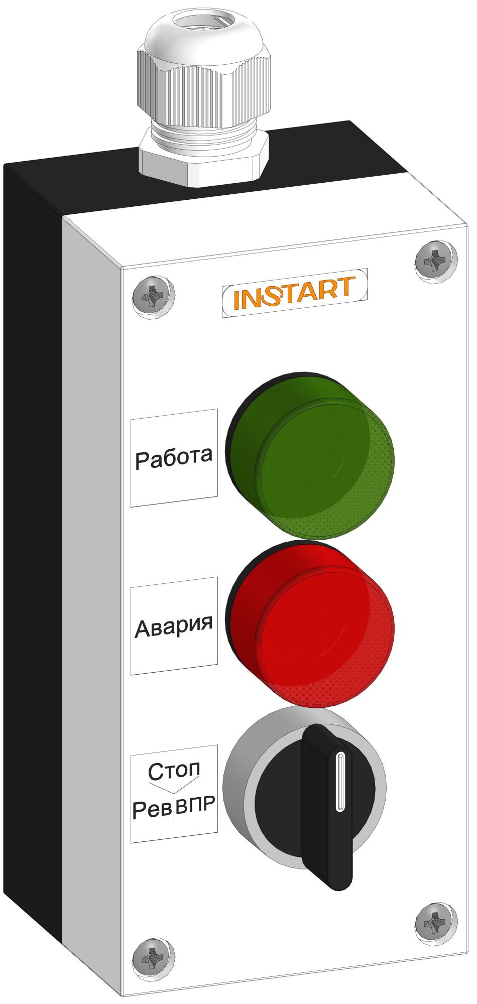 ПУ-3-720 – пульт управления, оснащённый индикацией в виде красной и зеленой лампы 24 В и 3-х позиционным переключателем. Предназначен для управления пуском, остановом и направлением вращения и индикации работы и аварии преобразователя частоты.