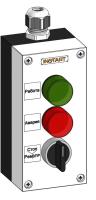 ПУ-3-820 – пульт управления, оснащённый индикацией в виде красной и зеленой лампы 230 В и 3-х позиционным переключателем. Предназначен для управления пуском, остановом и направлением вращения и индикации работы и аварии преобразователя частоты.