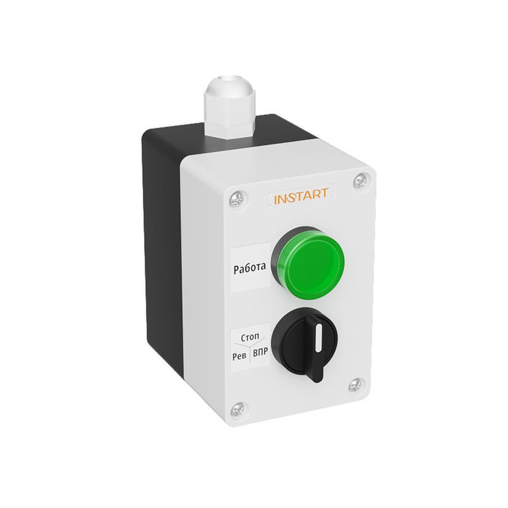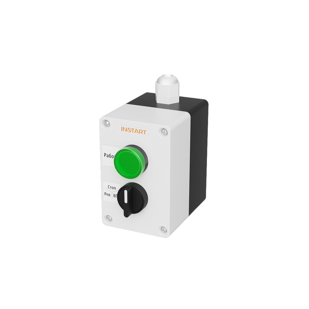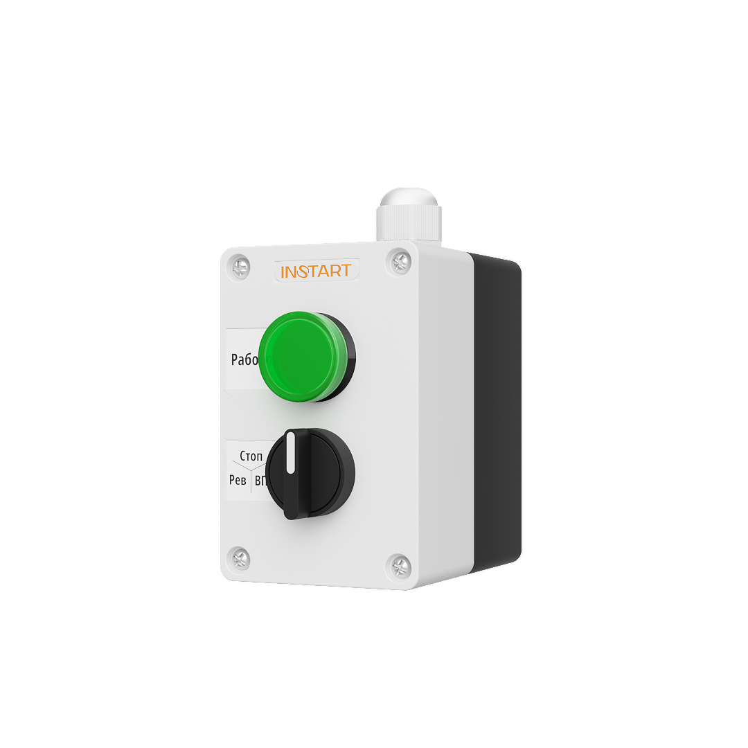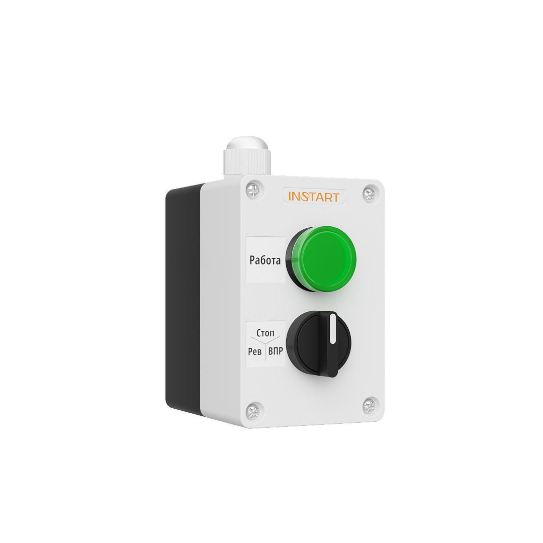 ПУ-2-220– пульт управления, оснащённый 3-х позиционным переключателем и индикацией в виде зелёной лампы 220 В. Предназначен для управления пуском, остановом, направлением вращения электродвигателя и индикации работы преобразователя частоты.