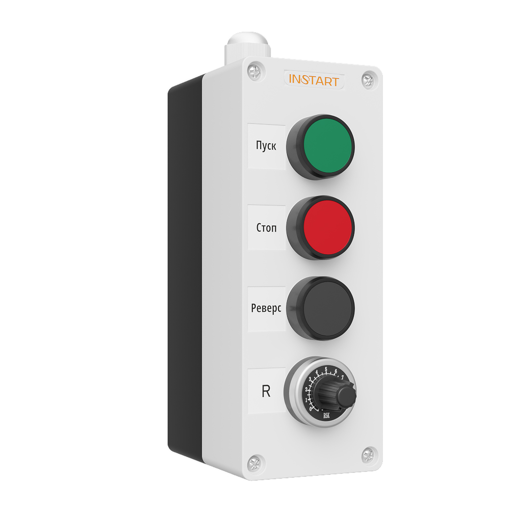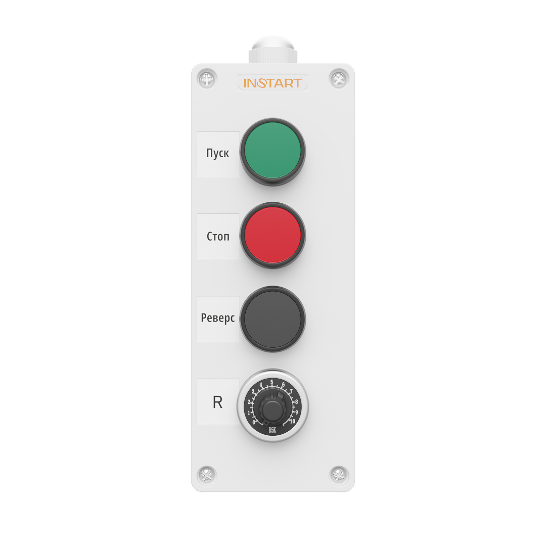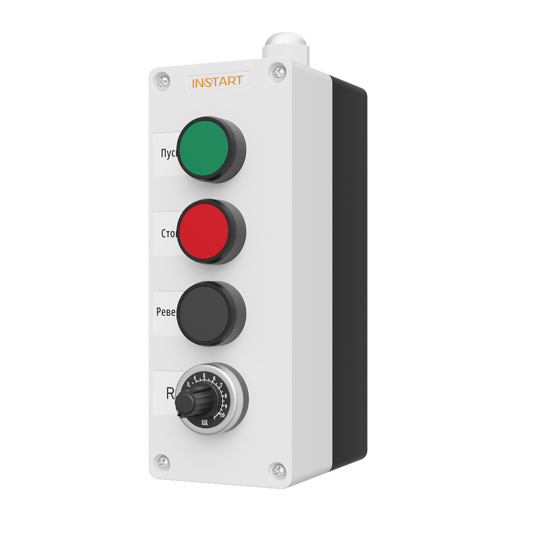 ПУ-4-051 – пульт управления оснащён потенциометрам, кнопками пуск, стоп, реверс. Предназначен для управления пуском, остановом, направлением и скоростью вращения электродвигателя.