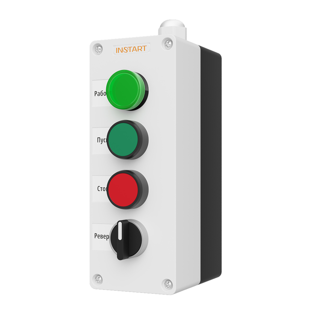ПУ-4-140 – пульт управления, оснащённый индикацией в виде лампы зелёной 24В, кнопками пуск/стоп, 2-х позиционным переключателем. Предназначен для управления пуском остановом, направлением вращения электродвигателя и индикации работы преобразователя частоты.