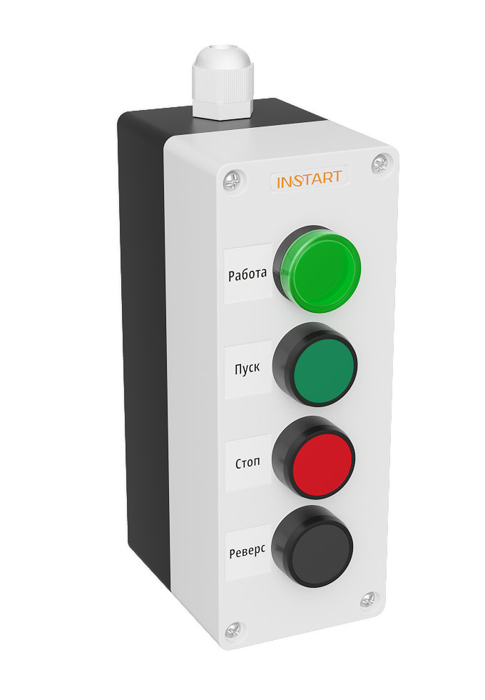 ПУ-4-250– пульт управления, оснащённый индикацией в виде зелёной лампы 220В, кнопками пуск/стоп/реверс. Предназначен для управления пуском остановом, направлением вращения электродвигателя, индикации работы преобразователя частоты.