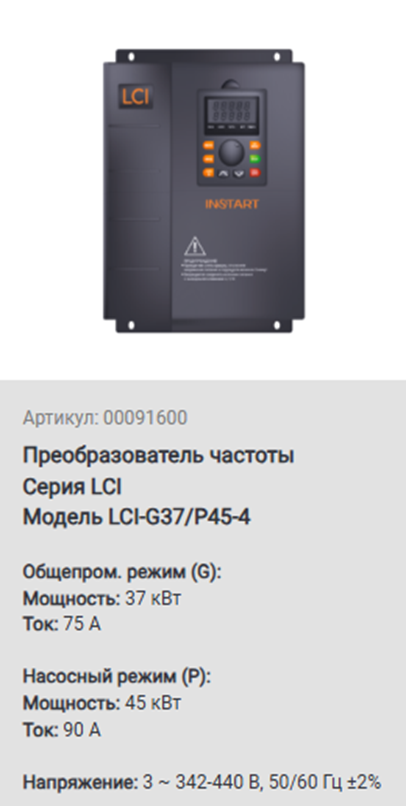 По первым трем параметрам подходят две модели преобразователя частоты INSTART: LCI-G45/P55-4 и LCI-G37/P45-4;